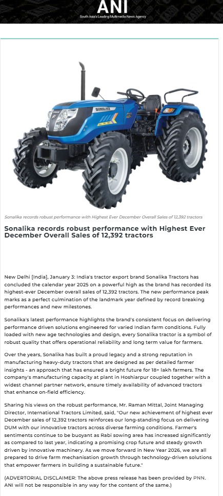 Sonalika Tractors recorded its highest-ever December sales in 2025, underscoring a year marked by steady market traction. Seasonal demand, improved crop prospects, and increasing mechanisation contributed to the result. The company continues to focus on developing region-specific tractor solutions that address evolving agricultural needs.